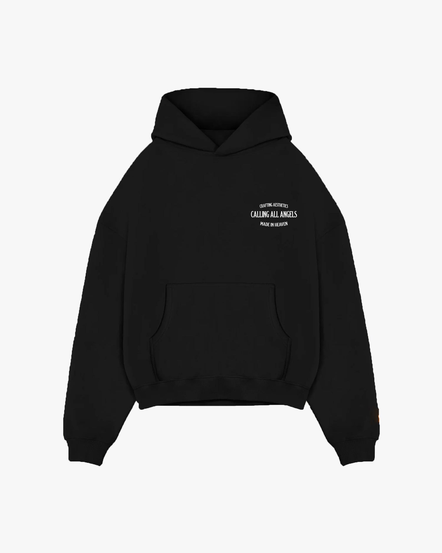 Unisex hoodie is crafted of cotton fleece that is dyed and washed for a soft hand-feel. It features Calling All Angels logo, a rib at the sleeve cuffs and the hem and front pocket.
