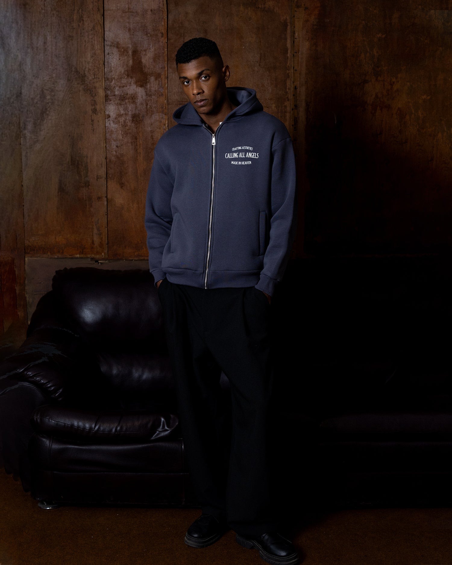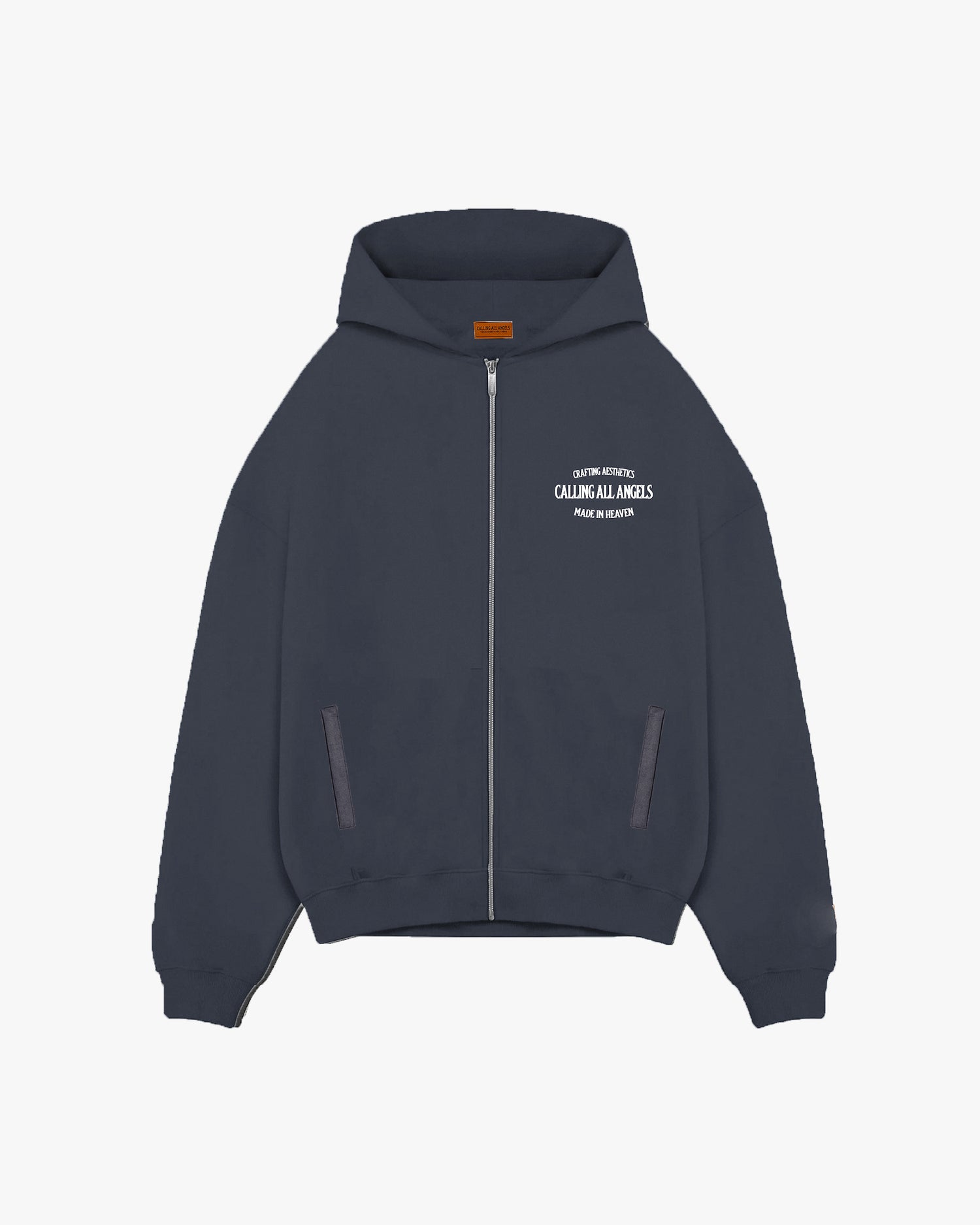 Unisex full zip hoodie is crafted of cotton fleece that is dyed and washed for a soft hand-feel. It features Calling All Angels stamp logo, a rib at the sleeve cuffs and the hem, zipper closure, and welt pockets on the sides.