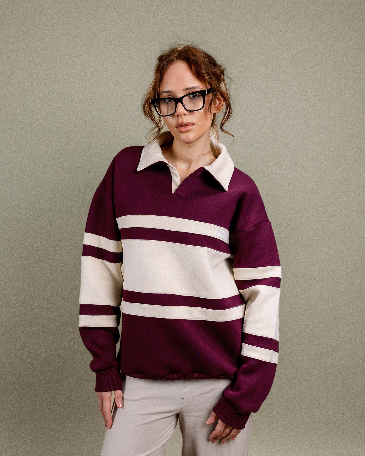 Unisex long sleeves rugby sweatshirt with slightly oversized fit, crafted from heavyweight cotton fleece. The rugby polo sweater has a ribbed hem and cuffs. This rugby sweatshirt features suede stripes along with suede collared neckline.